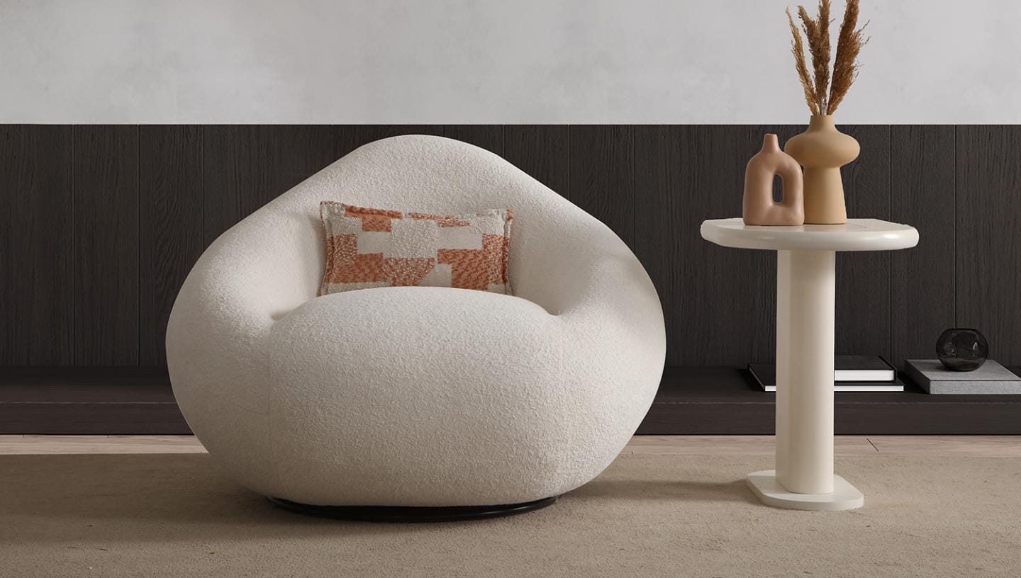 Zaokrąglone linie płynnie oplatają sylwetkę fotela, tworząc efekt luksusowego kokonu, który otula użytkownika miękkością i spokojem. Każdy element tej formy został dopracowany, aby podkreślić czystość geometrii, balans proporcji i wyjątkowy charakter kolekcji OLIVO.